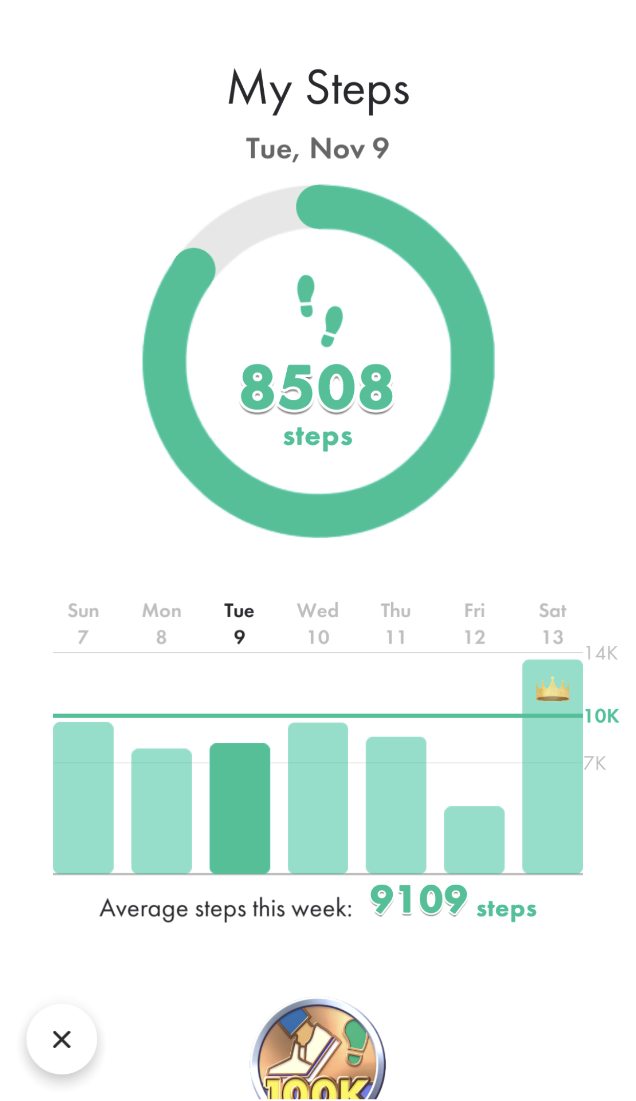 | Summary | The step viewer in Pikmin Bloom. By default, the vertical scale goes up to 10,000, but if a day that week goes over that amount, the scale will be adjusted to fit. The circle at the top always shows steps out of 10,000. |