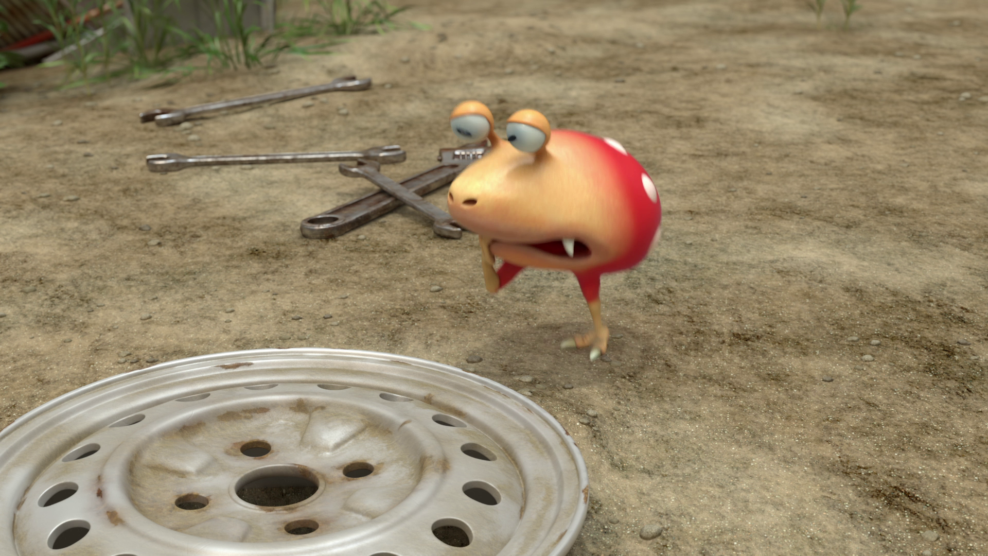 | Summary | A scene from Occupational Hazards, after the Bulborb kicked the tire rim keeping the Pikmin safe. |