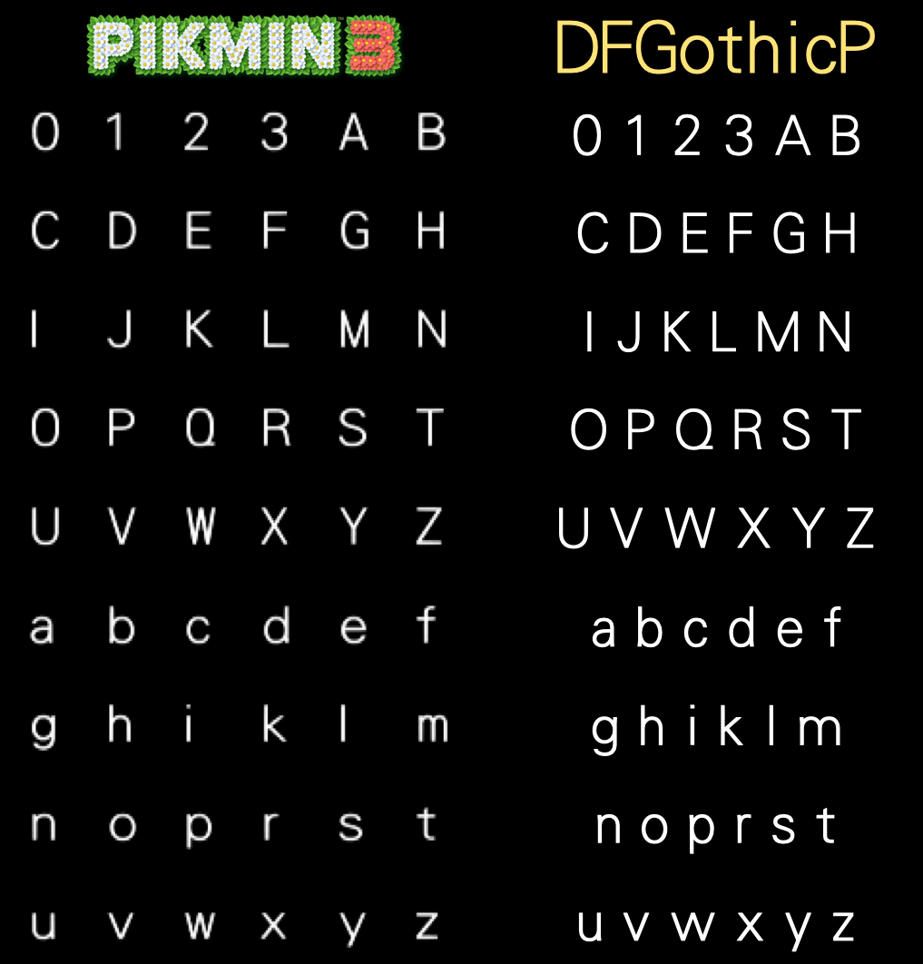 | Summary | Comparison between the font texture used for the staff roll in Pikmin 3, and the DFGothicP typeface. |