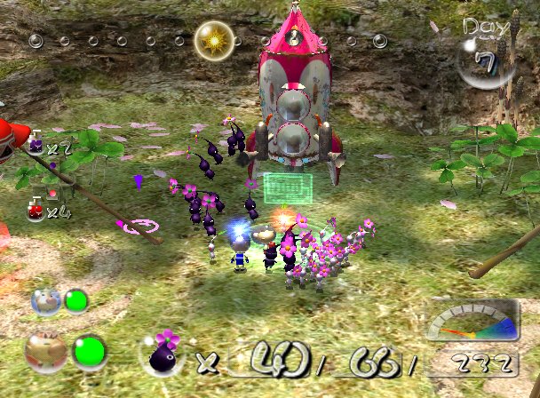 | Summary | A screenshot from a early version of Pikmin 2 showing Purple Pikmin coming out of the Hocotate Ship. |