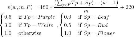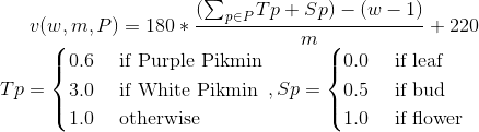 v(w, m, P) = 21.6 * \frac{ (\sum_{p\in P}^{ } Tp + Sp) - w + 1 }{m} + 26.4\\