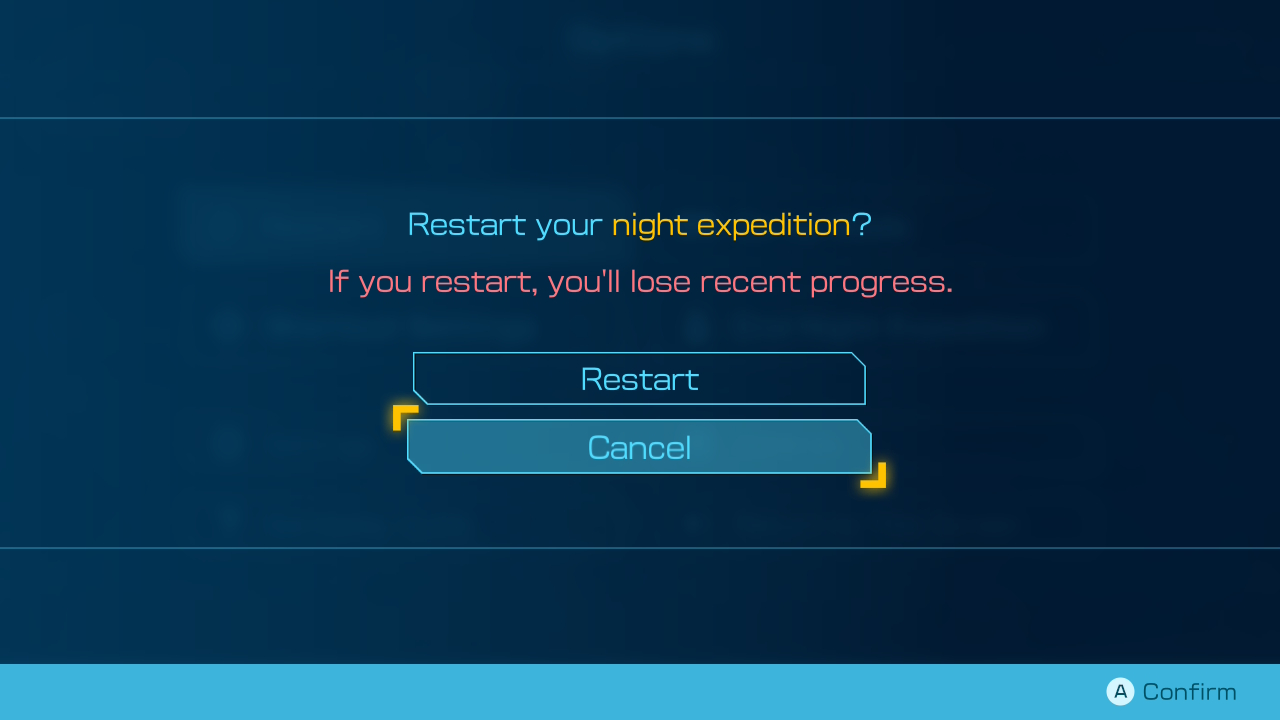 | current | 16:31, November 8, 2025 | 1,280 × 720 (209 KB) | Chazmatron (talk | contribs) | {{file info |summary = The restart menu in a night expedition. |type = screenshot |game = p4 }} Category:Menu images |