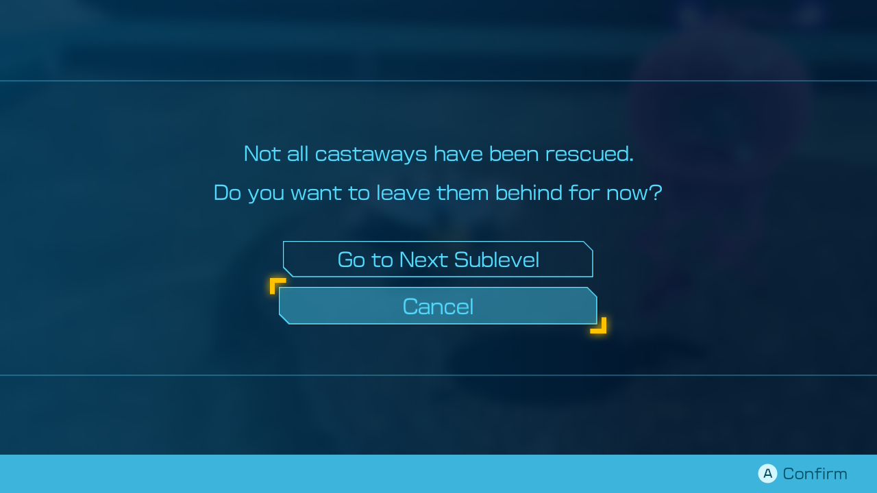 | Summary | The sublevel confirmation menu when a castaway is present in the cave in Pikmin 4. |