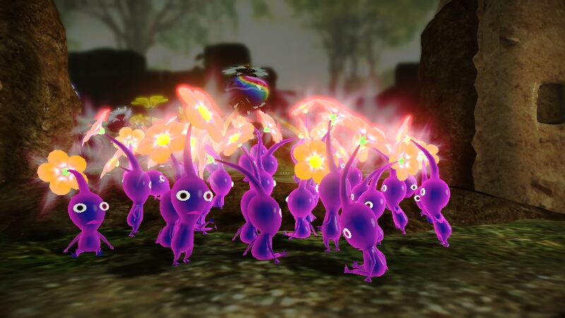 A group of Blue Pikmin under the effect of the ultra-spicy spray.