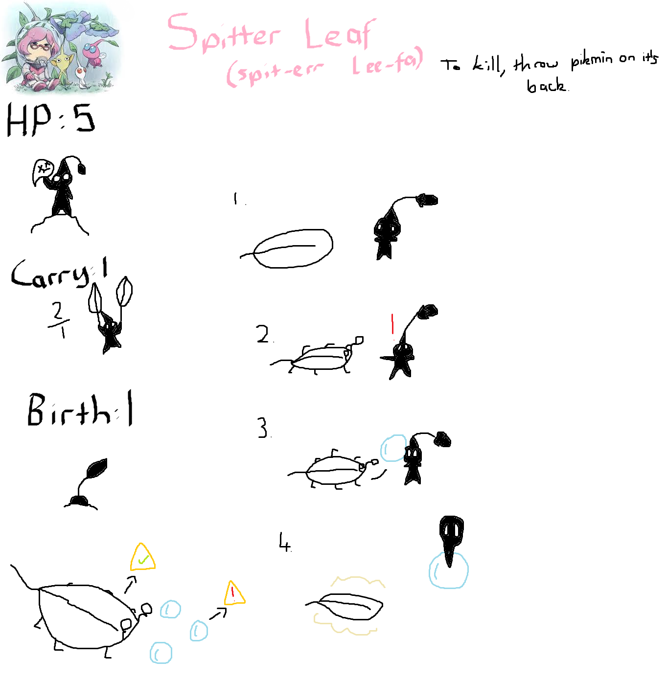 | Summary | The Spitter Leaf is an enemy that resembles a leaf with two red beady eyes and six legs, like an insect. It attacks by blowing bubbles that pikmin can fall or walk into, and if not blue pikmin, they can die without the bubble being popped. Spitter Leaves are close relatives of the Skitter Leaf, and are also in the same family. Do not underestimate it, though. As it can kill a ton of pikmin if you wander around the field too much. Eventually, the Spitter Leaf's bubbles will pop in a short period of time, which is a deep weakness. It takes about two seconds for it to pop, and has deathly low HP, so it can be killed quite easily |