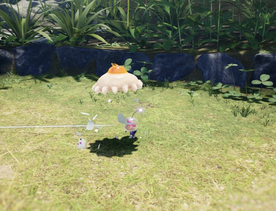 | Summary | A screenshot of a Sunsquish popping out an egg in Pikmin 4. |