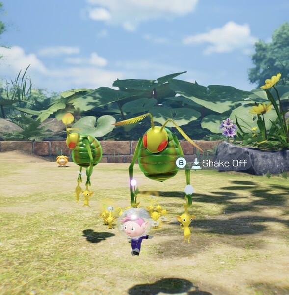 | Summary | A screenshot of two Swooping Snitchbugs carrying Pikmin and the Player in Pikmin 4. |