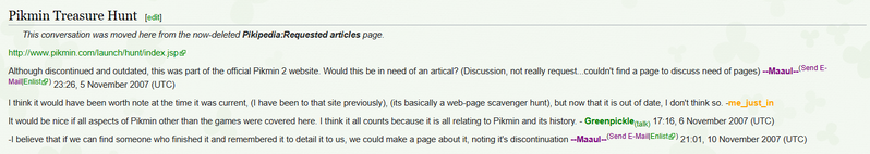 | Summary | Pikipedia users discussing Pikmin Treasure Hunt in 2007, apparently by this time it was defunct. |